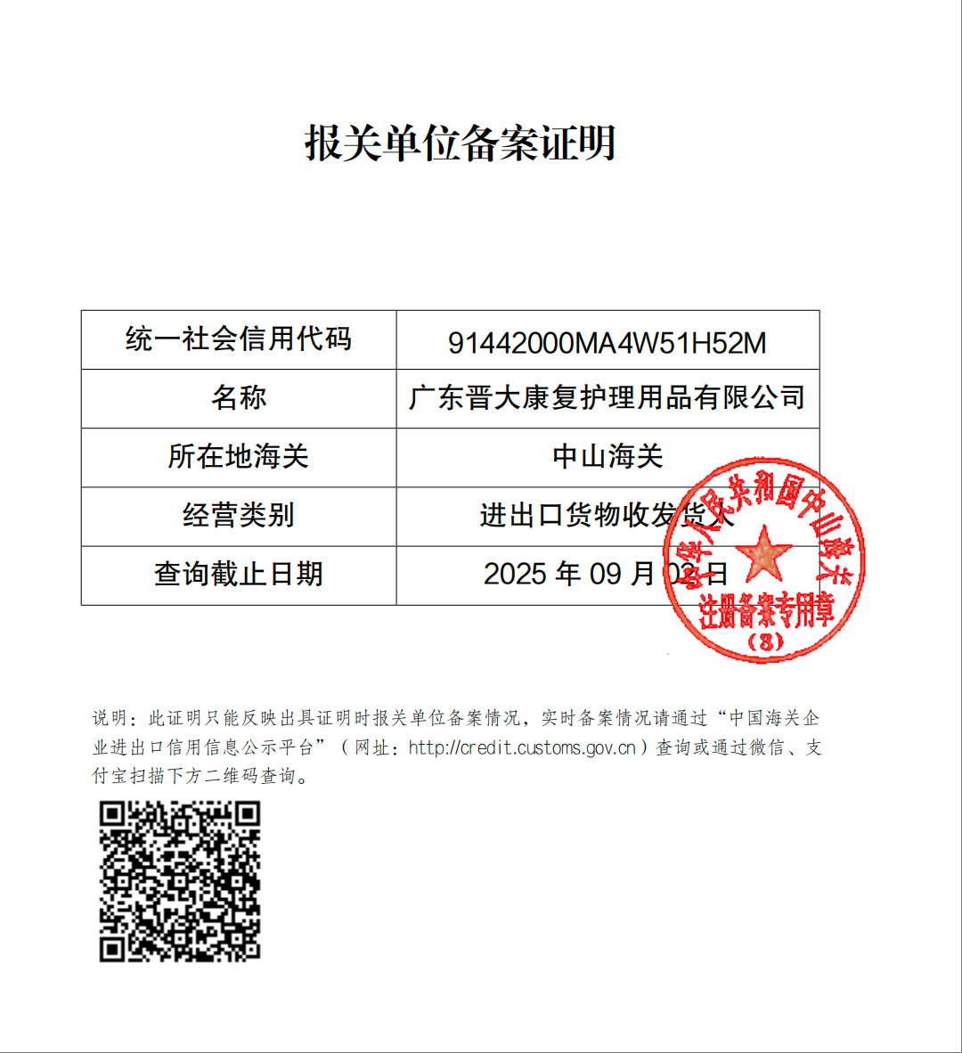 имеет право на самостоятельное осуществление экспортно-импортных операций Номер регистрационной анкеты участника внешнеторговой деятельности : 91442000MA4W51H52M Името на компания за износ : 广东晋大康复护理用品有限公司 Лиценз Фото :